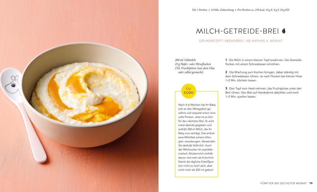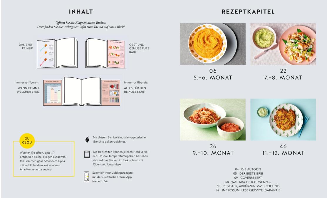 Inhalt: „5. bis 6. Monat“, „7. bis 8. Monat“, „9. bis 10. Monat“, „11. bis 12. Monat“ Grundrezepte für unterschiedliche Breiarten Übersichtliche Tabelle mit Alter und Angaben zum Brei Warenkunde Öl, Fleisch & Flocken Etwa 55 Fotos