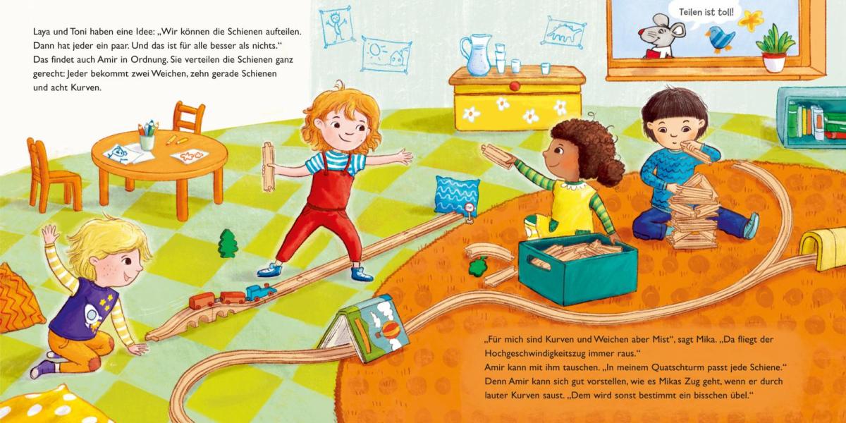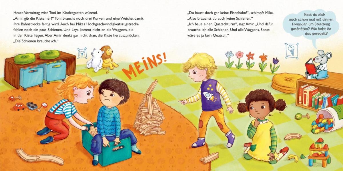 Diese Geschichte beschreibt humorvoll und auf Augenhöhe der Kinder wichtige Fähigkeiten für das soziale Miteinander, wie Teilen, abwechseln und Kompromisse finden.