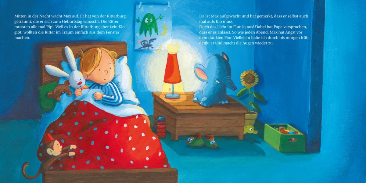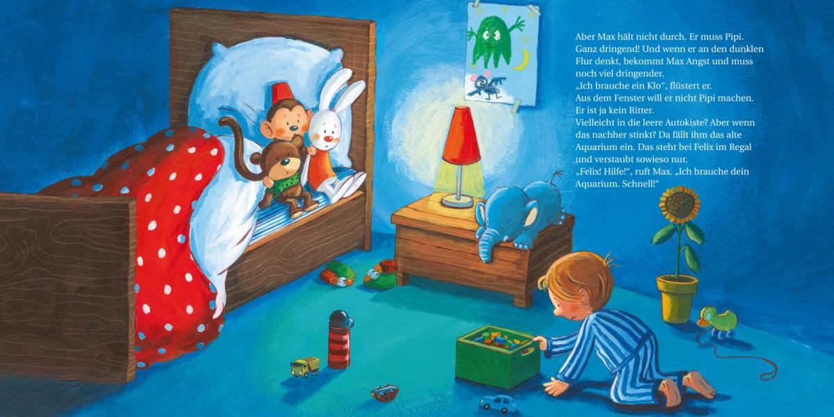 Normalerweise bleibt das Flurlicht bei Max zuhause nachts immer an. Aber ausgerechnet heute, als Max ganz dringend Pipi muss, ist das Licht aus! Es ist stockfinster im Flur. Und der Lichtschalter ist so weit weg. Max hat Angst. Aber zum Glück weiß er sich zu helfen!