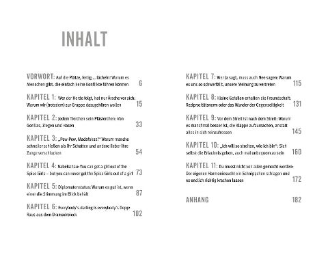 Hinweis zur OptimierungImpressumVorwort: Auf die Plätze, fertig ... lächeln! Warum es Menschen gibt, die einfach keine Konflikte führen könnenKapitel 1: Wer der Herde folgt, hat nur Ärsche vor sich: Warum wir (trotzdem) zur Gruppe dazugehören wollenKapitel 2: Jedem Tierchen sein Pläsierchen: Von Gorillas, Ziegen und HasenKapitel 3: "Pew-Pew, Madafakas!"Warum manche schneller schießen als ihr Schatten und andere lieber ihre Zunge verschluckenKapitel 4: Nabelschau: You can get a girl out of the Spice Girls - but you can never get the Spice Girls out of a girlKapitel 5: Diplomatenstatus: Warum es gut ist, wenn einer die Stimmung im Blick behältKapitel 6: Everybody's darling is everybody's Depp: Raus aus dem DramadreieckKapitel 7: Wer Ja sagt, muss auch Nee sagen: Warum es uns so schwerfällt, unsere Meinung zu vertretenKapitel 8: Kleine Gefallen erhalten die Freundschaft: Reziprozitätsnorm oder das Wunder der GegenseitigkeitKapitel 9: Vor dem Streit ist nach dem Streit: Warum es manchmal besser ist, die Klappe aufzumachen, anstatt alles in sich reinzufressenKapitel 10: "Ich will so streiten, wie ich bin": Sich selbst die Erlaubnis geben, auch mal unbequem zu seinKapitel 11: Du musst nicht von allen gemocht werden: Der eigenen Harmoniesucht ein Schnippchen schlagen und es endlich richtig krachen lassenAnhangLea Blumenthal