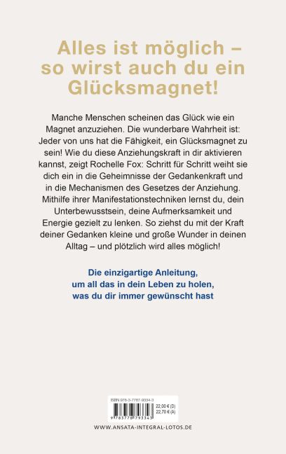 Manche Menschen scheinen das Glück wie ein Magnet anzuziehen. Die wunderbare Wahrheit ist: Jeder von uns hat die Fähigkeit, ein Glücksmagnet zu sein! Der englische Shootingstar Rochelle Fox zeigt, wie wir diese Anziehungskraft in uns aktivieren können. Schritt für Schritt weiht sie uns ein in die Geheimnisse der positiven Gedankenkraft und in die Wirkmechanismen des Gesetzes der Anziehung. Mithilfe ihrer Meditations- und Manifestationstechniken lernen wir, unser Unterbewusstsein, unsere Aufmerksamkeit und Energie gezielt zu lenken. So ziehen wir mit der Kraft unseres Geistes kleine und große Wunder in unseren Alltag - und plötzlich wird alles möglich!