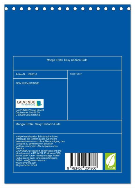 Dieser Kalender zeigt die einzigartige Verschmelzung von Manga-Kunst und Erotik. Jede Illustration wurde mit Hilfe von KI erstellt und zeigt ein selbstbewusstes Manga-Mädchen, das mit Charme und Sinnlichkeit bezaubert. Die Bilder sind eine Hommage an die verspielte und gleichzeitig verführerische Ästhetik der Manga-Welt. Tauche ein in eine Welt voller Lachen, Schönheit und verlockender Blicke.