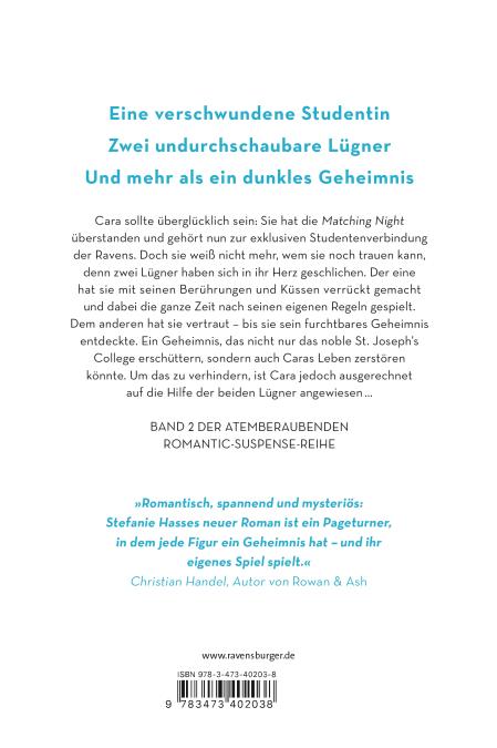 Cara sollte überglücklich sein: Sie hat die Matching Night überstanden und gehört nun zur exklusiven Studentenverbindung der Ravens. Doch sie weiß nicht mehr, wem sie noch trauen kann, denn zwei Lügner haben sich in ihr Herz geschlichen. Der eine hat sie mit seinen Berührungen und Küssen verrückt gemacht und dabei die ganze Zeit nach seinen eigenen Regeln gespielt. Dem anderen hat sie vertraut - bis sie sein furchtbares Geheimnis entdeckte. Ein Geheimnis, das nicht nur das noble St. Joseph's College erschüttern, sondern auch Caras Leben zerstören könnte. Um das zu verhindern, ist Cara jedoch ausgerechnet auf die Hilfe der beiden Lügner angewiesen...