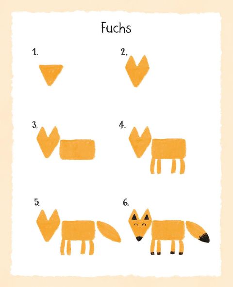 Elefant, Blume, Rakete, Schloss oder Einhorn - diese Zeichenschule für Kinder ab 4 Jahren bietet über 100 Motive zum Nachzeichnen. Das geht ganz leicht: Zunächst werden Schritt für Schritt die Grundformen der Figur gemalt, anschließend folgen die Details. So entsteht z.B. aus drei Dreiecken und einem Quadrat ein Fuchs. Der Vorteil: Beim Gestalten mit Flächen wird noch nicht ganz so viel Planung und Genauigkeit wie beim Zeichnen von Umrisslinien benötigt. Das erhöht das Erfolgserlebnis der kleinen Zeichenkünstler und den Spaß.