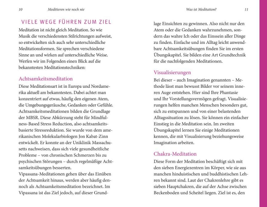 Meditation ist eine Bewusstseinsübung, die uns hilft, uns auf das Hier und Jetzt zu konzentrieren, zu entschleunigen und wieder zu uns zu kommen. Doch wie soll man die Ruhe dazu finden, wenn die Zeit rast und das Leben immer unübersichtlich wird? Mit den Kurzmeditationen für jede Gelegenheit, während man auf den Zug wartet, im Stau steht oder beim Arzt sitzt, wird verloren geglaubte Zeit zum Geschenk. Keine dauert länger als drei Minuten. Die Wahrnehmung schärft sich, man landet sanft wieder in der Gegenwart, fühlt sich klar im Kopf und lernt sich selbst besser kennen. Je öfter man die kleinen Übungen für jede Situation und jede Problemstellung durchführt, desto mehr wirken sich die tiefe Entspannung, innere Klarheit und Zufriedenheit auf alle Lebensbereiche aus.