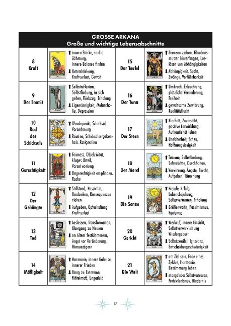 Alle Spreads sind verständlich erklärt und durch Illustrationen verdeutlicht. In praktischen Tabellen kannst du außerdem Schlüsselbegriffe und astrologische Korrespondenzen aller Karten für eine schnelle Deutung nachsehen.