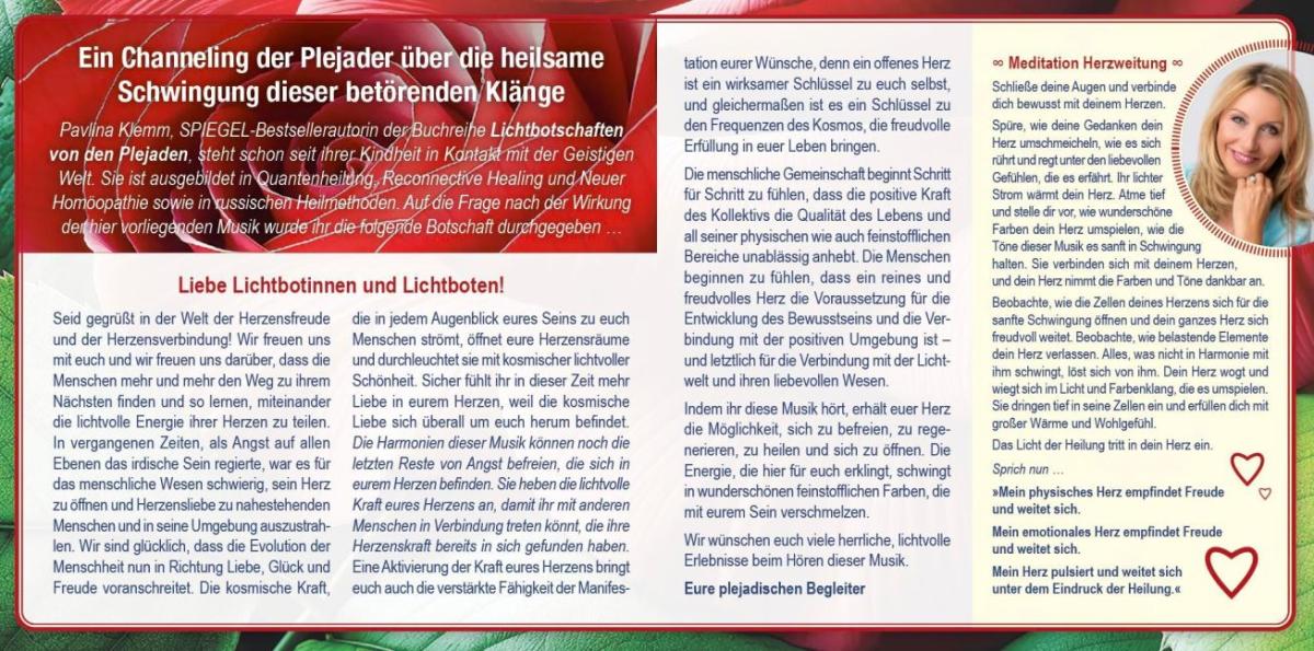 HERZENSFREUDE & HERZENSVERBINDUNG durch Solfeggio 639 Hertz Diese Heilmusik berührt das Herz. Basierend auf der Solfeggio-Frequenz 639¿Hz, die für Miteinander, Herzöffnung und harmonischen Austausch steht, fördern die Kompositionen innere Balance, emotionale Heilung und spirituelle Rückverbindung. Zusätzliche Frequenzen wie 197¿Hz und 1150¿Hz unterstützen Herz-Hirn-Kohärenz und Zellheilung. Begleitet von sanftem Vogelgezwitscher entsteht ein Klangraum voll Ruhe, Licht und Geborgenheit, eine Einladung zu Liebe, Vertrauen und tiefem Loslassen - für ein neues Miteinander im Einklang mit der Geistigen Welt. Diese Musik fördert Mitgefühl, löst innere Blockaden, mildert Angst und Trauer und öffnet das Tor zur bedingungslosen Liebe - auch zu sich selbst. Die drei Stücke auf dieser CD: 1. Herzweitung - 21:33 2. Herzheilung - 19:16 3. Herzöffnung - 36:12 Das achtseitige Booklet enthält eine gechannelte Botschaft der SPIEGEL-Bestsellerautorin Pavlina Klemm sowie drei stärkende Meditationen, die zu den Klängen der Musik durchgeführt werden können. »Bei dieser Musik weitet sich dein Herz, es heilt und beginnt sich zu öffnen.« - Die Plejader Liebe anziehen. Liebe manifestieren. Beziehungen stärken. Verständnis & inneres Gleichgewicht fördern. MICHAEL REIMANN ÜBER SEINE KOMPOSITION: »Diese Musik lag mir wirklich am Herzen. Wie sehr habe ich mich nach Harmonien gesehnt, die in dieser herausfordernden Zeit bei so vielen Menschen wie möglich das Herz weiten, es heilen und öffnen, damit sie einen Zustrom an Liebe erfahren und dadurch leichter Liebe an ihre Nächsten verströmen können. Und den Ausgangspunkt, liebe Hörerin, lieber Hörer, sollte die Solfeggio-Frequenz 639 Hertz bilden. Sie steht für harmonische Kommunikation, für Verbindung und Vernetzung, sie hebt Kontaktschwierigkeiten auf und ist gut gegen Herzenskälte, Herzerkrankungen, hilft bei hohem und niedrigem Blutdruck, erhöhten Cholesterinwerten, bei Lungenbeschwerden, Asthma, Allergien, Rheuma und vielem mehr. Deshalb habe ich in allen Stücken mehr oder weniger durchgehend 639 Hertz verwendet. Und nachdem das erste Stück das Herz weiten sollte, ging es beim zweiten Stück um die Heilung des Herzens, deshalb kamen hier noch zwei Frequenzen hinzu, nämlich 197 Hertz für die Herbeiführung der Herz-Hirn-Kohärenz und 1150 Hertz gegen Parasiten auf Zellebene. Diese zusätzlichen Frequenzen führten zwar dazu, dass eine Grundstimmung von 432 Hertz nicht erreicht werden konnte, wohl aber 428 Hertz, was zusammen mit dem Vogelgezwitscher viel Ruhe und Entspannung in die Heilung bringt. Und so war der Raum geschaffen für die eigentliche Öffnung des Herzens, die im langen dritten Stück erfolgt, das bei geweitetem und geheiltem Herzen Ihre Herzenskraft bündelt, damit Sie sie hinausschicken können in die Geistigen Welten, um andere Menschen und Wesenheiten zu erreichen, mit denen Sie sich in Liebe und tiefem Vertrauen verbinden möchten. Diese Harmonien sind in der Lage, sinnstiftende und tiefgehende Beziehungen zu ermöglichen, Verständnis, Toleranz und Liebe zu fördern - das soziale Miteinander, das wir für eine bessere Gesellschaft brauchen. Die Musik auf diesem Album versetzt Schwingungen in Resonanz, die positiv auf die Themen Angst und Schuldgefühle einwirken. Ein intensives Zuhören ermöglicht die Auflösung verborgener Blockaden und negativer Emotionen, auch bei Trauer und Kummer. Und diese Chance hat mir und uns allen die Solfeggio-Frequenz 639 Hertz eröffnet. Eine Herzöffnung war mein Ziel, die heute nicht nur hilfreich, sondern sogar überaus notwendig geworden ist. Erinnern wir uns, was Antoine de Saint-Exupéry im Kleinen Prinzen sagt: >Man sieht nur mit dem Herzen gut. Das Wichtigste ist für die Augen unsichtbar.< Wir verstehen sofort, was gemeint ist. Das Herzensgefühl! Und ich habe versucht, Ihr Herz mit diesen Kompositionen in ein Gefühl der Liebe, der Sicherheit und des Wohlbefindens zu versetzen, damit Sie sich nach dem Hören besser fühlen und die richtigen Herzensentscheidungen für Ihr Leben treffen können. Welche bessere Voraussetzung gäbe es, um sich wiederzuverbinden mit der Geistigen Welt, ein harmonisches Geben und Nehmen in unserer Welt zu praktizieren und bedingungslose Liebe zu leben - auch zu sich selbst.« Auf HERZÖFFNUNG wurden Strings, Stimmen, Gitarre, eine armenische Duduk, eine indische Bansuri, Bass, Synthesizer, Piano und Vogelgezwitscher verwendet. MICHAEL REIMANN wurde durch seine Solo-Konzerttätigkeit als Multi-Instrumentalist und Obertonsänger bekannt. Er arbeitete unter anderen mit Joachim-Ernst Berendt und Christian Bollmann zusammen sowie als Pianist mit dem WDR Köln. Seit dreißig Jahren gibt er immer wieder Konzerte und Seminare in ganz Europa.