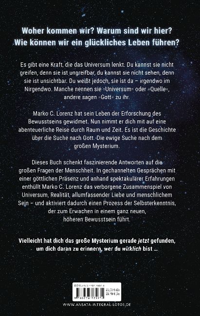 Marko C. Lorenz hat sein Leben der Erforschung des Bewusstseins gewidmet. Nun nimmt er dich mit auf eine abenteuerliche Reise durch Raum und Zeit. Es ist die Geschichte über die Suche nach Gott. Die ewige Suche nach dem großen Mysterium.