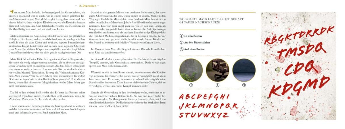 Ein junger Mann erwacht in einem finsteren Kellerabteil. Er ist allein, hat keine Ahnung, wie er dort hingelangt ist oder wer dahinter steckt. Er weiß nur eins: Er muss hier raus - bevor es zu spät ist! Doch dazu muss er sich 24 mysteriösen Rätselaufgaben stellen ... Dieser Adventsthriller stellt deine grauen Zellen auf eine harte Probe. Denn, nur wer es schafft, ein Rätsel zu lösen, erfährt, wo es am nächsten Tag weitergeht! Welche abenteuerliche Geschichte steckt hinter dem düsteren Weihnachtsverlies?
