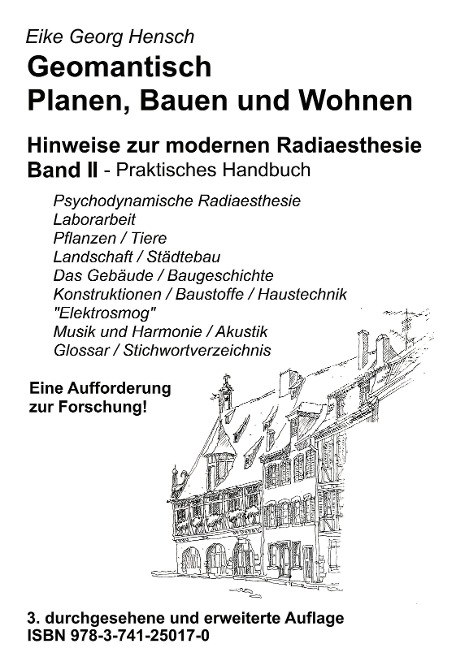 Im zweiten Band von Geomantisch Planen, Bauen und Wohnen werden städtebauliche und gebäudekundliche Fragen beantwortet und Hinweise zum geomantischen Planen unter radiaesthetisch erfassbaren Gesichtspunkten gegeben. Dabei spielen auch konstruktive und haustechnische Belange bis hin zum "Elektrosmog" eine besondere Rolle.Einem eigenen Kapitel ist die radiaesthetische Laborarbeit gewidmet. Dabei werden medizinische und psychische Aspekte zum Wohnen angesprochenIm Weiteren sind geomantische Betrachtungen zur Pflanzen- und Tierwelt, sowie zu Fragen der Akustik, Musik, Harmonie und Astrologie angesprochen. Im Band II befinden sich ein Glossar zur modernen Radiaesthesie und ein ausführliches Stichwortverzeichnis, auch für Band I. Ein Farbbildteil ergänzt die behandelten Themen.