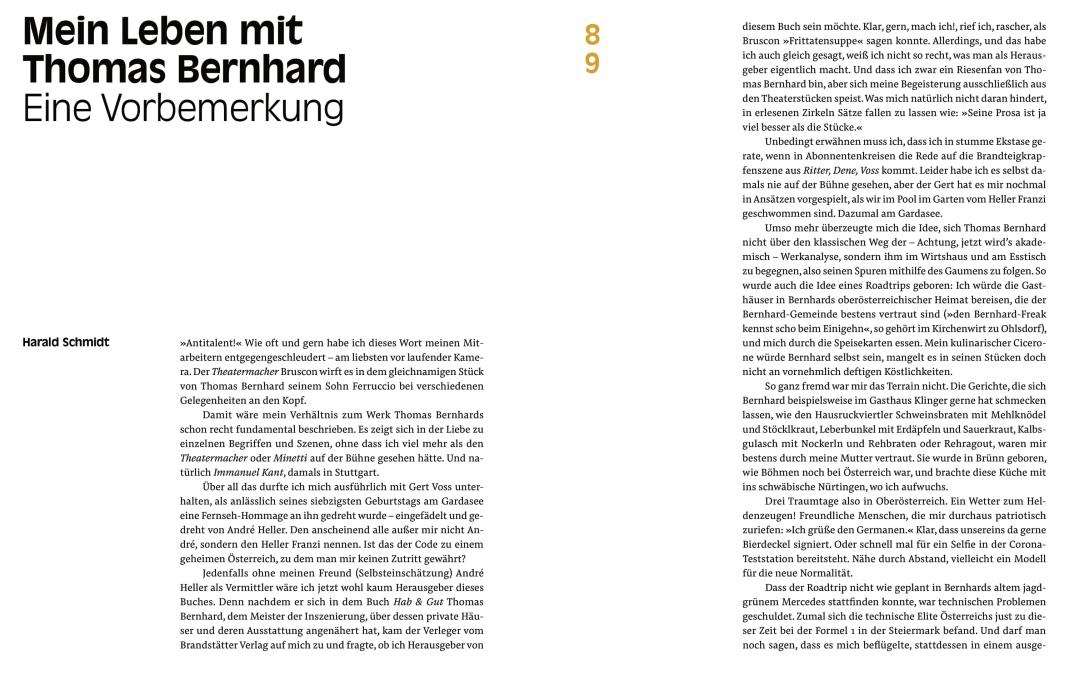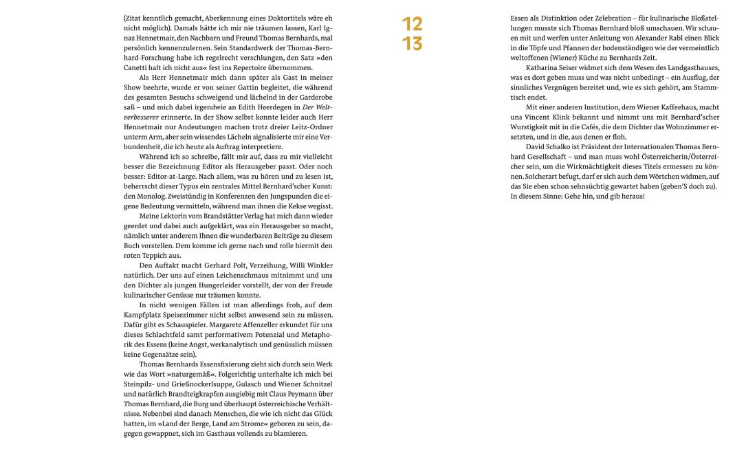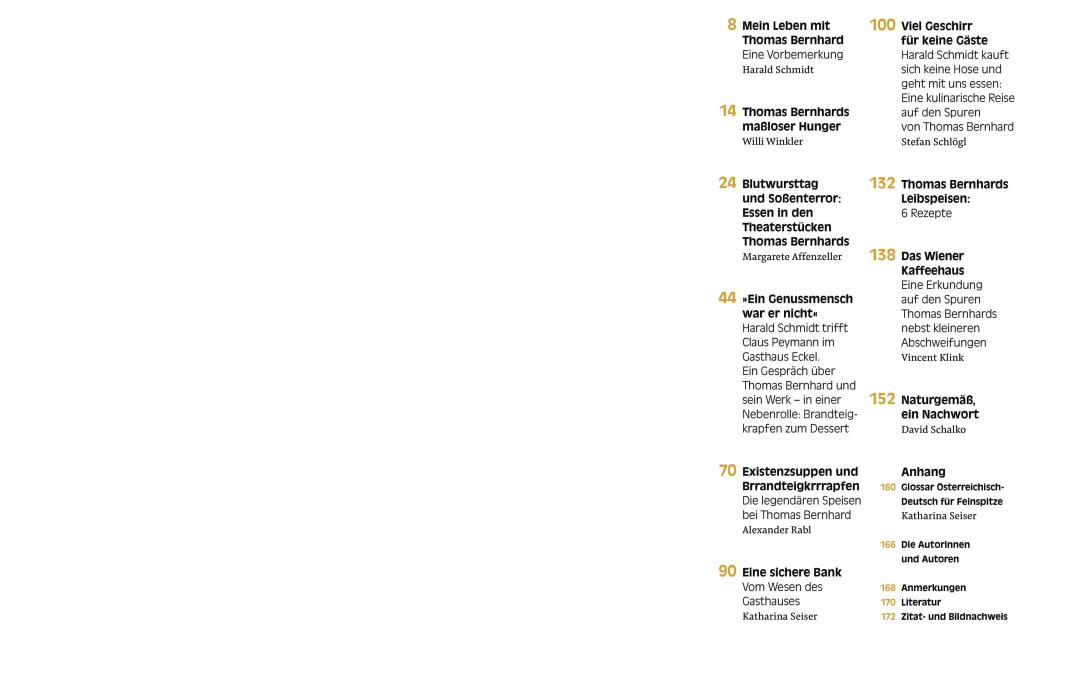 Ob an Brandteigkrapfen gewürgt wird oder es um den Fettgehalt der Frittatensuppe geht, Thomas Bernhard ließ in fast allen seinen Werken die Menschen ausgiebig speisen und offenbarte dabei zerfleischende Zustände. Er selbst war ein regelmäßiger Besucher von Wirtshäusern und den Wiener Kaffeehäusern. Wie lohnenswert und inspirierend es ist, sich Thomas Bernhards Werk und seiner Persönlichkeit über den Esstisch hinweg anzunähern, zeigt Harald Schmidt mit diesem Buch. Auf einem Roadtrip quer durch Bernhards Lieblingsgasthäuser und zusammen mit vielen hochkarätigen Autoren und Wegbegleitern hat er sich auf die kulinarischen Spuren von Thomas Bernhard begeben – gemeinsam entfalten sie einen überraschenden und lustvollen Blick auf das Wesen und das Werk von Thomas Bernhard.