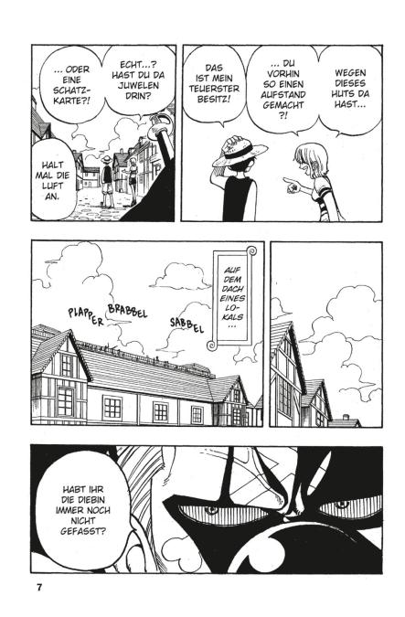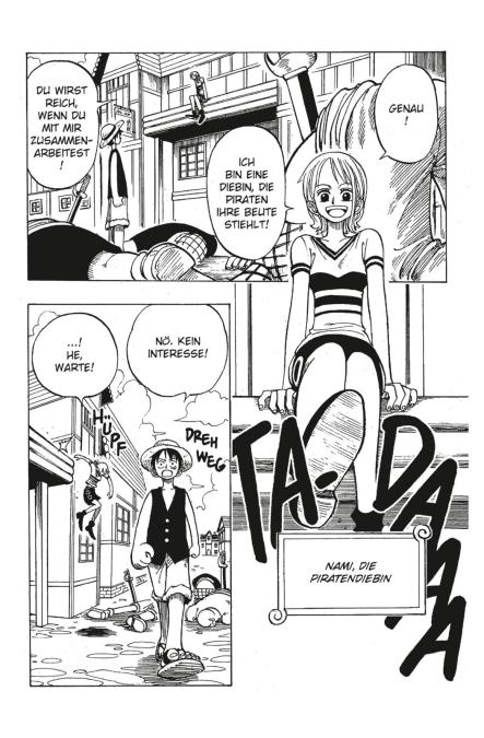Auf der Suche nach einer geeigneten Mannschaft macht sich Ruffy mit Zorro zusammen auf den Weg zur Grand Line. Doch auf dem Weg begegnen sie der Diebin Nami, die Piraten beklaut und Buggy, dem Clown, einem berüchtigten Piraten, die Seekarte zur Grand Line klauen will. Da Nami auch navigieren kann, will Ruffy sie unbedingt im Team haben und macht sich damit Buggy zum Feind...