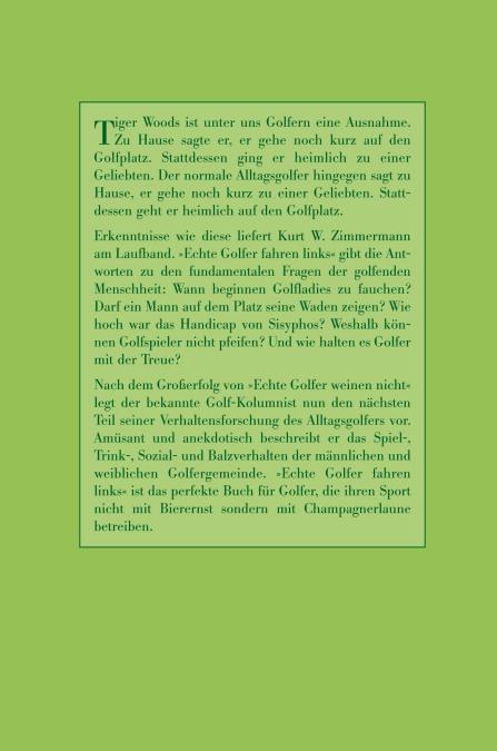 Es geht wieder einmal um die fundamentalen Fragen der Menschheit: Wann beginnt jede Golflady zu fauchen? Warum reden schlechte Spieler mehr? Darf ein Mann auf dem Platz seine Waden zeigen? Wie halten es Golfer mit der Treue? Wie hoch ist das Handicap von Sisyphos? Weshalb können Golfspieler nicht pfeifen? Nach dem Großerfolg von "Echte Golfer weinen nicht" legt Kurt W. Zimmermann nun den nächsten Teil seiner Verhaltensforschung des Alltagsgolfers vor. In "Echte Golfer fahren links" beschreibt er erneut detailkundig und amüsant das Spiel-, Trink-, Sozial- und Balzverhalten der männlichen und weiblichen Golfergemeinde. "Echte Golfer fahren links" ist das perfekte Buch für Spieler, die ihren Sport nicht mit Bierernst sondern mit Champagnerlaune betreiben.