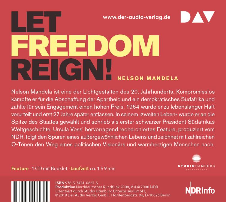 Nelson Mandela ist eine der Lichtgestalten des 20. Jahrhunderts. Kompromisslos kämpfte er für die Abschaffung der Apartheid und ein demokratisches Südafrika und zahlte für sein Engagement einen hohen Preis. 1964 wurde er zu lebenslanger Haft verurteilt und erst 27 Jahre später entlassen. In seinem »zweiten Leben« wurde er an die Spitze des Staates gewählt und schrieb als erster schwarzer Präsident Südafrikas Weltgeschichte. Das hervorragend recherchierte Feature des NDR folgt den Spuren eines außergewöhnlichen Lebens und zeichnet mit zahlreichen O-Tönen den Weg eines politischen Visionärs und warmherzigen Menschen nach.