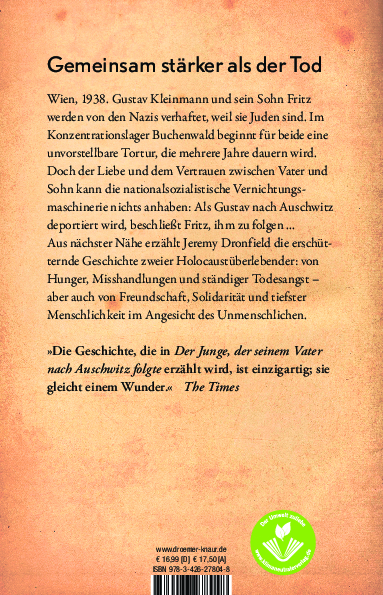 Fritz Kleinmann fasst einen unglaublichen Beschluss. Da er seinen Vater nicht allein lassen will, folgt er ihm nach Auschwitz. Jeremy Dronfields Bestseller "Der Junge, der seinem Vater nach Auschwitz folgte" ist ein eindringliches Plädoyer gegen das Vergessen. Basierend auf den geheimen Tagebüchern des jüdischen KZ-Häftlings Gustav Kleinmann, erzählt der Autor in diesem historischen Sachbuch die Geschichte von Gustav und seinem Sohn Fritz, die den "Todesfabriken" der Nazis entkamen.