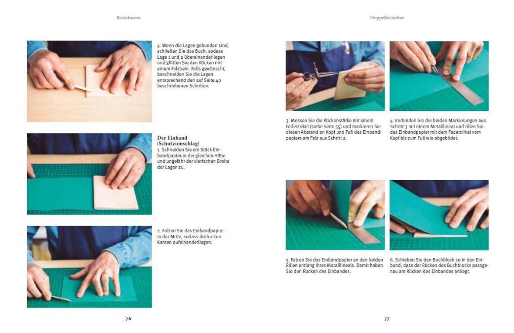 Die handwerkliche Schönheit des Buchbindens spiegelt sich in dem sehr liebevoll gestalteten Layout, das den Leser mit einer Mischung aus inspirierender und praktischer Bebilderung durch die einzelnen Schritte des Buchbindens führt.
