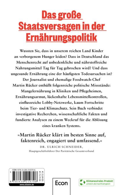 Der ehemalige Foodwatch-Geschäftsführer Martin Rücker legt das verheerende Staatsversagen offen – von der Ernährungsarmut über haarsträubendes Kontrollversagen bis zum Wirken von Strippenzieher:innen in Verbänden und im Bundestag. Sein Buch verbindet investigative Recherchen, anschaulichen Wissenschaftsjournalismus und fundierte politische Analyse zu einem Weckruf für die Ablösung eines kranken Systems.