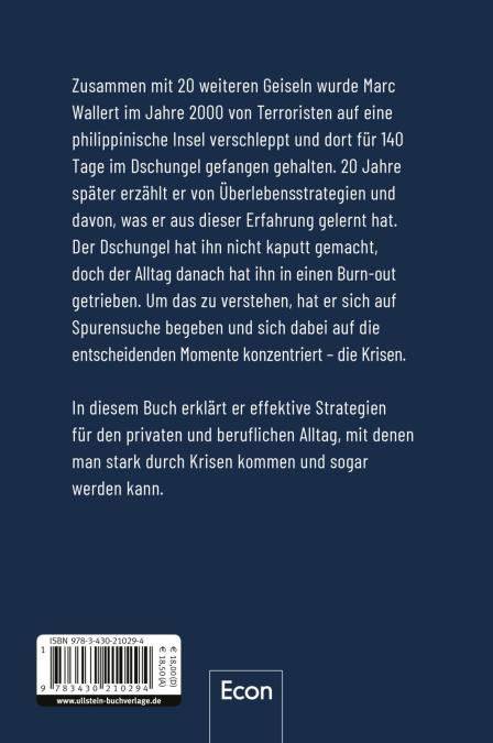 Zusammen mit 20 weiteren Geiseln wurde Marc Wallert im Jahre 2000 von Terroristen auf eine philippinische Insel verschleppt und dort für 140 Tage im Dschungel gefangen gehalten. 20 Jahre später erzählt er von Überlebensstrategien und davon, was er aus dieser Erfahrung gelernt hat. Der Dschungel hat ihn nicht kaputt gemacht, doch der Alltag danach hat ihn in einen Burn-out getrieben. Um das zu verstehen, hat er sich auf Spurensuche begeben und sich dabei auf die entscheidenden Momente konzentriert - die Krisen. In diesem Buch erklärt er effektive Strategien für den privaten und beruflichen Alltag, mit denen man stark durch Krisen kommen und sogar werden kann.