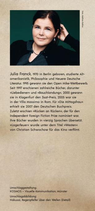 Julia Franck wurde 1970 in Berlin geboren. Sie studierte Altamerikanistik, Philosophie und Neuere Deutsche Literatur an der FU Berlin. 1997 erschien ihr Debüt ›Der neue Koch‹, danach ›Liebediener‹ (1999), ›Bauchlandung. Geschichten zum Anfassen‹ (2000) und ›Lagerfeuer‹ (2003). Sie verbrachte das Jahr 2005 in der Villa Massimo in Rom. Für ihren Roman ›Die Mittagsfrau‹ erhielt Julia Franck den Deutschen Buchpreis 2007. Der Roman wurde in 40 Sprachen übersetzt, ein Kinofilm ist in Vorbereitung. Nach ›Rücken an Rücken‹ (2011) erschien zuletzt ›Welten auseinander‹ (Platz 1 der SWR-Bestenliste). Für ihr Werk wurde sie 2022 mit dem Schiller-Gedächtnis-Preis ausgezeichnet.Literaturpreise:1995 Siegerin beim Open Mike-Wettbewerb1998 Alfred-Döblin-Stipendium der Akademie der Künste1999 Stipendium der Stiftung Niedersachsen2000 3sat-Preis in Klagenfurt2004 Marie Luise Kaschnitz Preis2005 "Roswitha Preis" der Stadt Bad Gandersheim2007 Deutscher Buchpreis2010 war die englische Ausgabe der ›Mittagsfrau‹ auf der Shortlist des Independent Foreign Fiction Prize und auf der Shortlist des ›Jewish Quaterly‹ sowie für den internationalen IMPAC nominiert.2022 Schiller-Gedächtnis-Preis