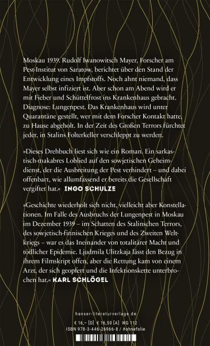 Moskau 1939. Rudolf Iwanowitsch Mayer berichtet über den Stand der Entwicklung eines Impfstoffs gegen die Pest. Niemand ahnt, dass der Forscher selbst infiziert ist. Aber am Abend wird er ins Krankenhaus gebracht. Diagnose: Lungenpest. Das Krankenhaus wird unter Quarantäne gestellt, wer mit ihm Kontakt hatte, zu Hause abgeholt. In der Zeit des Großen Terrors fürchtet jeder, in Stalins Folterkeller zu kommen. Oberst Pawljuk erschießt sich, als der schwarze Wagen vor seiner Tür hält, eine Frau verrät ihren Mann an den Geheimdienst ... Was geschieht, wenn eine Epidemie auf eine paralysierte Gesellschaft trifft? Scharfsichtig und mit großer Empathie beobachtet Ljudmila Ulitzkaja die Reaktionen der Menschen.