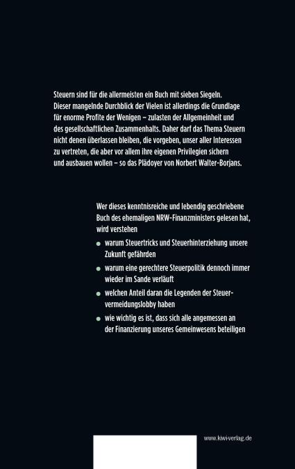 Kein Politiker hat in den letzten Jahren so entschieden Klartext geredet, so konsequent gegen die Seuche des Steuerbetrugs gekämpft und Steuerungerechtigkeiten angeprangert wie der ehemalige NRW-Finanzminister Norbert Walter-Borjans. Durch Ankauf von Daten über Steuerhinterzieher oder die gezielte Rückenstärkung erfolgreicher Steuerfahndungsbehörden hat er dem Gemeinwesen Milliardenbeträge gesichert und so das öffentliche Unrechtsbewusstsein gegenüber Steuerkriminalität gestärkt. Er hat immer wieder versucht, die Ungerechtigkeiten und Schwächen unseres Steuersystems ins Zentrum der politischen Auseinandersetzungen zu rücken und Ideen für größere Transparenz, Einfachheit und Gerechtigkeit bei den Steuern entwickelt. Auf Widerstand ist er dabei nicht nur bei den Lobbyisten des großen Kapitals und globaler Unternehmen gestoßen, sondern auch in den politischen Parteien bis hin zu seiner eigenen, der SPD.