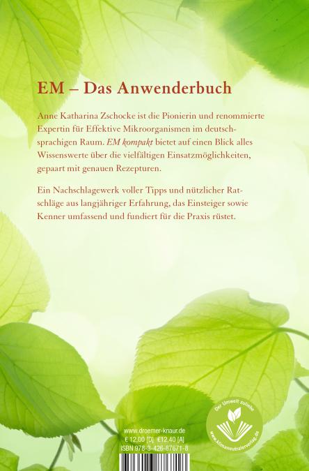 Kurz aber umfassend werden alle notwendigen Grundlagen der Effektiven Mikroorganismen von der Pionierin und führenden Expertin Anne Katharina Zschocke beschrieben und die praktische Verwendung erklärt. Im thematischen Praxisteil mit alphabetisch angeordneten Anwendungen kann man leicht alle gängigen Einsatzmöglichkeiten mit Dosierungen einzeln nachschlagen. Zahlreiche Tipps und Hinweise, die sich aus der jahrzehntelangen Erfahrung mit EM entwickelten, ergänzen die praktischen Anleitungen.