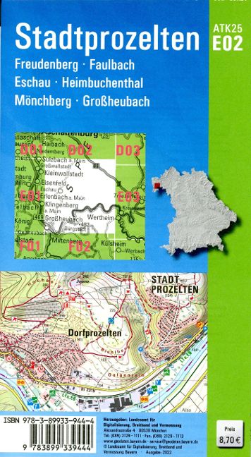Kartenblatt ATK25-E02 Stadtprozelten:REGION: Unterfranken, Baden-Württemberg, Spessart, MainviereckORTE: Stadtprozelten, Freudenberg, Faulbach, Eschau, Heimbuchenthal, Mönchberg, Großheubach