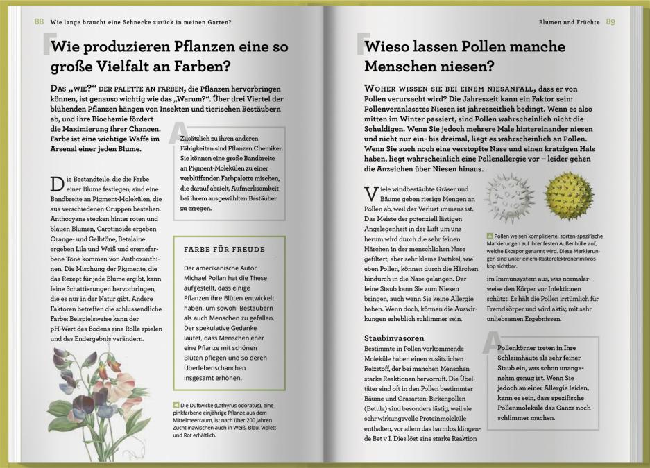 Haben Sie sich jemals gefragt, wie Regenwürmer arbeiten? Oder warum manche Bäume so groß sind? Dieses Buch bietet fachmännische Antworten auf die Fragen, die sich so mancher Gärtner bereits gestellt hat oder niemals daran gedacht hätte, sich zu stellen. Vollgepackt mit Fotografi en, schönen Vintage-Gravuren und einleuchtenden Diagrammen, wird von der praktischen über die leicht verrückte bis hin zur verwunderlichen Frage alles beantwortet, was man sich nur vorstellen kann. Erfahrungskästen bieten praktische Anleitungen, sodass Sie Ihr neu gefundenes Wissen gleich auf Ihren eigenen Garten anwenden können. Geschrieben vom Chefgärtner der Royal Horticultural Society (der britischen königlichen Gartenbaugesellschaft), ist dieses Buch das ideale Geschenk für neugierige Gärtner mit Humor.
