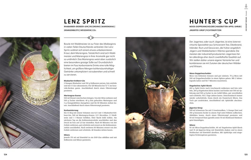 Er erläutert, wie sich modernstes Equipment wie Rotationsverdampfer oder Dehydrator für Getränke einsetzen lässt und experimentiert mit ungewöhnlichen Präsentationsformen und Texturen. Ganz nebenbei erweitert er das Aromenspektrum seiner Cocktails um Zutaten wie Steinpilze, Vogelbeeren oder Parmesan und vermittelt einen Eindruck davon, wie die Bar der Zukunft aussehen könnte. In einem eigenen Kapitel geht Hinz dazu der Frage nach, wie sich der moderne Barbetrieb nachhaltiger gestalten lässt und zeigt Möglichkeiten zum Sparen von Ressourcen und der Reduzierung von Lebensmittelverschwendung auf.