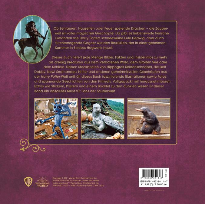 Dieses Buch liefert jede Menge Bilder, Fakten und Insiderinfos zu mehr als dreißig Kreaturen aus dem Verbotenen Wald, dem Großen See oder dem Schloss. Neben Steckbriefen von Hippogreif Seidenschnabel, Hauself Dobby, Newt Scamanders Niffler und anderen geheimnisvollen Geschöpfen aus der "Harry Potter"- Welt enthält dieses Buch faszinierende Illustrationen sowie Fotos und spannende Geschichten von den Filmsets. Vollgepackt mit herausnehmbaren Extras wie Stickern, Postern und einem Booklet zu den dunklen Wesen ist dieser Band ein absolutes Muss für Fans der Zauberwelt.