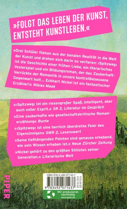 >Spitzweg< ist die Geschichte einer frühen Liebe, ein literarisches Vexierspiel und ein Bildungsroman, der das Zauberhaft-Verrückte der Romantik in unsere kontrollbesessene Gegenwart holt¿... Eckhart Nickel ist ein fantastischer Erzähler!« Niklas Maak