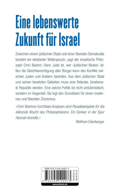 Eine lebenswerte Zukunft für Israel Zwischen einem jüdischen Staat und einer liberalen Demokratie besteht ein eklatanter Widerspruch, sagt der israelische Philosoph Omri Boehm. Denn Jude ist, wer »jüdischen Blutes« ist. Nur die Gleichberechtigung aller Bürger kann den Konflikt zwischen Juden und Arabern beenden. Aus dem jüdischen Staat und seinen besetzten Gebieten muss eine föderale, binationale Republik werden. Eine solche Politik ist nicht antizionistisch, sondern im Gegenteil: Sie legt den Grundstein für einen modernen und liberalen Zionismus. »Omri Boehms furchtlose Analysen sind Paradebeispiele für die klärende Wucht des Philosophierens. Ein Denker in der Spur Hannah Arendts.« Wolfram Eilenberger