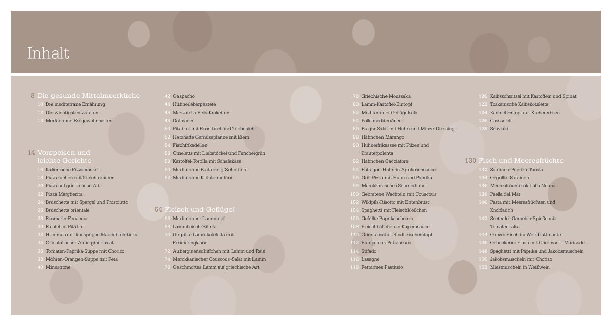 Vieles spricht also dafür, sich die Eigenschaften der mediterranen Küche zunutze zu machen, denn bereits kleine Veränderungen im täglichen Speiseplan können die Gesundheit auf Dauer stärken. In Gesunde Ernährung auf mediterrane Art finden sich daher 128 gesunde Rezepte mit Gerichten aus der griechischen, spanischen, türkischen oder italienischen Küche, die mit viel mediterranem Gemüse, Fisch, Kräutern und weiteren gesunden Zutaten zubereitet werden. Hier finden Sie köstliche und gesunde Rezepte wie