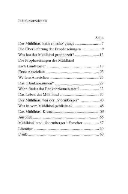 Das Buch enthält alle Prohezeiungen des Mühlhiasl, die der Verfasser ausführlich kommentiert und erläutert. Der Autor versucht auch Antworten auf Fragen zu geben, wann nun das große "Bankabräumen", das der Mühlhiasl prophezeit hat, stattfinden wird. Das Buch gibt einen Einblick in das eindrucksvolle Leben des Waldpropheten.