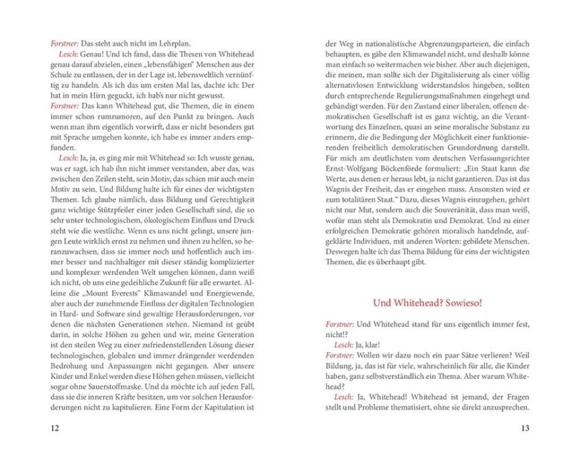Intensiv, kurzweilig und anregend diskutieren Lesch, Forstner und Vossenkuhl Whiteheads Thesen zur Erziehung und Bildung des Menschen und erörtern didaktische Zusammenhänge. Sie fordern ihre Leser dazu auf, das Schul- und Bildungssystem grundsätzlich in Frage zu stellen und neu zu denken.