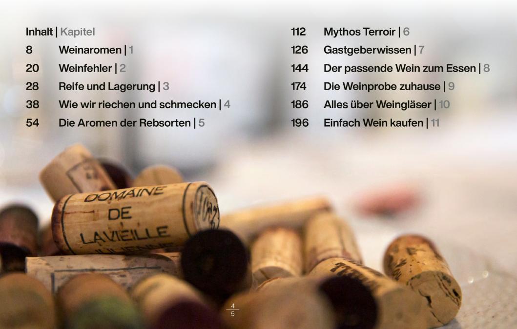 Die ganze Welt des Riechens und Schmeckens lässt sich bei kaum einem anderen Produkt so spannend erklären und in die Praxis umsetzen wie beim Wein. Von der Funktion unserer Sinne bis zur Anleitung für praktische Übungen erklärt das Buch alles leicht verständlich und nachvollziehbar. Außerdem werden die wichtigsten Rebsorten der Welt und ihre Aromen vorgestellt. Eine Anleitung zu Weinprobe zuhause und einige grundlegende Regeln zur Kombination von Wein und Speisen runden das Buch ab.
