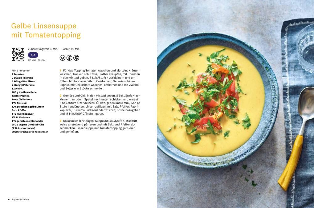 Innovative Technik und kreative WW Rezeptideen ergeben zusammen wunderbare Möglichkeiten. Schon das erste Kapitel, das sich ganz um Suppen und Salate dreht, bietet Verlockendes: Gelbe Linsensuppe mit Tomatentopping, Gemüse-Reis-Salat mit Datteln oder ein asiatischer Rohkostsalat - hier wird es in der Küche niemals langweilig. Im Kapitel Fleisch und Fisch stellen wir unter anderem ein mediterranes Hühnerfrikassee sowie Kokosgarnelen mit Blumenkohlreis vor. Das schmeckt, ist gesund und hält schlank. Pasta, Reis & Co. - wer liebt sie nicht. Probieren Sie doch einmal ein Zucchini-Ziegenkäse-Risotto mit Rucola oder würzige Kartoffel-Wirsing-Puffer. Und kein Kochbuch wäre vollständig, wenn sich nicht auch ein Kapitel süßen Mahlzeiten und Desserts widmen würde. Wir empfehlen einen köstlichen Zitronen-Karottenkuchen zum Nachtisch - oder doch lieber ein schnelles Erdbeer-Joghurt-Eis? Das Special zum Thema Brotbacken und Aufstriche rundet die Rezeptsammlung ab. Ob Burgerbrötchen oder Kräuter-Knoblauch-Baguette, ob Schafskäse-Schinken-Dip oder Stracciatella-Aufstrich - für Abwechslung auf dem Tisch ist gesorgt.