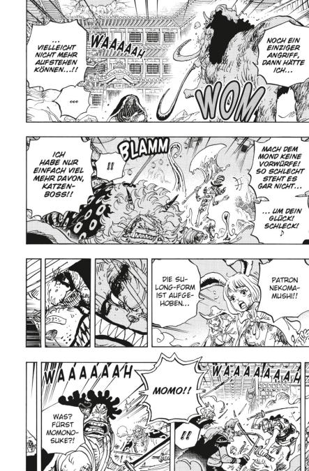 Ruffy ist zurück und stellt sich erneut dem Kampf gegen Kaido! Das Duell zwischen den beiden Ausnahmekämpfern geht nun in die entscheidende Phase! Wie wird es enden?! Währenddessen kommt auch für Ruffys Freunde, die an verschiedenen Orten auf Onigashima gegen Kaidos Kommandanten kämpfen, der Moment der Entscheidung. Der ultraspannende Höhepunkt des Wa-no-Kuni-Arc!!