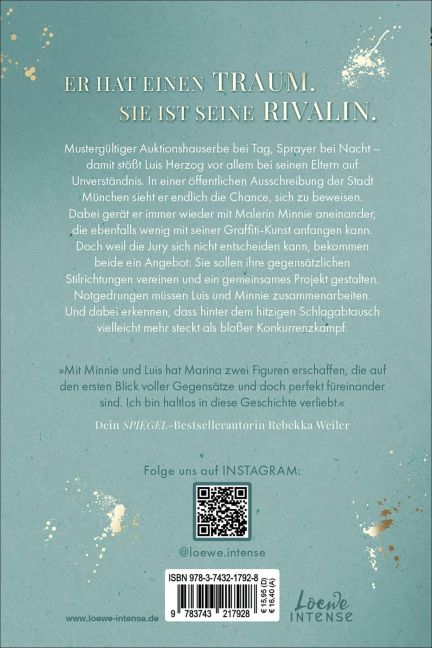 Im abschließenden Band ihrer New-Adult-Reihe in der Münchner High Society bringt Marina Neumeier mit Graffiti und Malerei nicht nur zwei Kunstrichtungen zusammen, die unterschiedlicher nicht sein könnten, sondern macht auch zwei leidenschaftliche Enemies to Lovers .