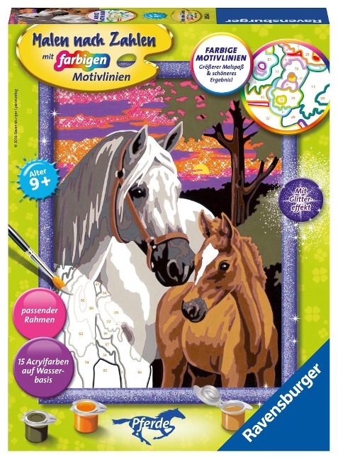 Mit Malen nach Zahlen von Ravensburger lernen die Kinder Flächen sorgfältig auszumalen, ihr Maltalent zu verbessern sowie feinmotorische Fähigkeiten zu entwickeln. Am Ende stehen Freude, Stolz und ein Erfolgserlebnis, das die Lust am Weitermalen weckt. Die Motive sind altersgerecht in drei Schwierigkeitsstufen umgesetzt: von einfachen Bildern mit wenigen, großen Malflächen bis hin zu Bildern mit vielen, kleinen Malflächen für Fortgeschrittene. Jedes Malset enthält alles, was Künstler zum Malen brauchen und es ist kein Mischen der Farben notwendig. Das Ravensburger Malen nach Zahlen Programm bietet eine große Motivauswahl für Kinder und Erwachsene.