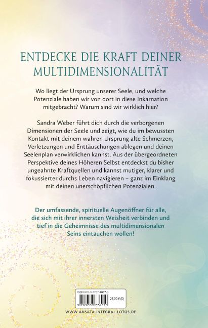 Wo liegt der Ursprung unserer Seele und welche Potenziale haben wir von dort in diese Inkarnation mitgebracht? Warum sind wir wirklich hier? Sandra Weber führt uns durch die verborgenen Dimensionen der Seele und zeigt, wie wir im bewussten Kontakt mit unserem wahren Ursprung alte Schmerzen, Verletzungen und Enttäuschungen ablegen und unseren Seelenplan verwirklichen können. Indem wir lernen, mehr und mehr die höhere Perspektive unserer Seele einzunehmen, entdecken wir unsere innerste Kraft und können frei von Angst offen durchs Leben navigieren: mit fokussierter Klarheit und in vollem Einklang mit unseren unerschöpflichen Potenzialen. >