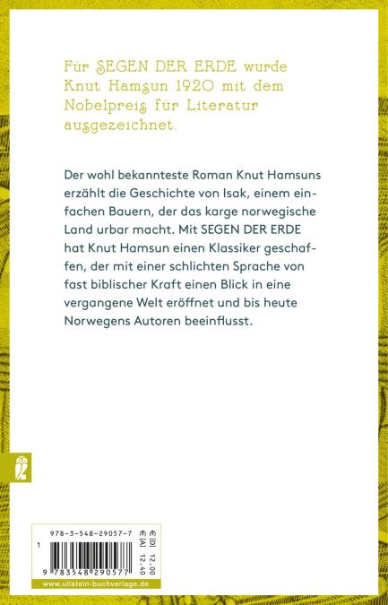 Für SEGEN DER ERDE wurde Knut Hamsun 1920 mit dem Nobelpreis für Literatur ausgezeichnet. Der wohl bekannteste Roman Knut Hamsuns erzählt die Geschichte von Isak, einem einfachen Bauern, dxer das karge norwegische Land urbar macht. Mit SEGEN DER ERDE hat Knut Hamsun einen Klassiker geschaffen, der mit einer schlichten Sprache von fast biblischer Kraft einen Blick in eine vergangene Welt eröffnet und bis heute Norwegens Autoren beeinflusst.