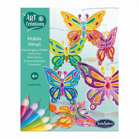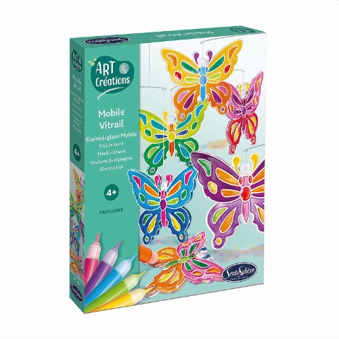 Bastelset zum Herstellen von schönen Schmetterlings-Glasmalereien, durch Einspritzen der gewählten Farben in die dekorativen Rahmenhalterungen. Inhalt: 8 Plexiglas-Schmetterlinge, 4 Mobilehänger, transparente Nylonschnüre, 10 Buntglasfarben und eine Anleitung.