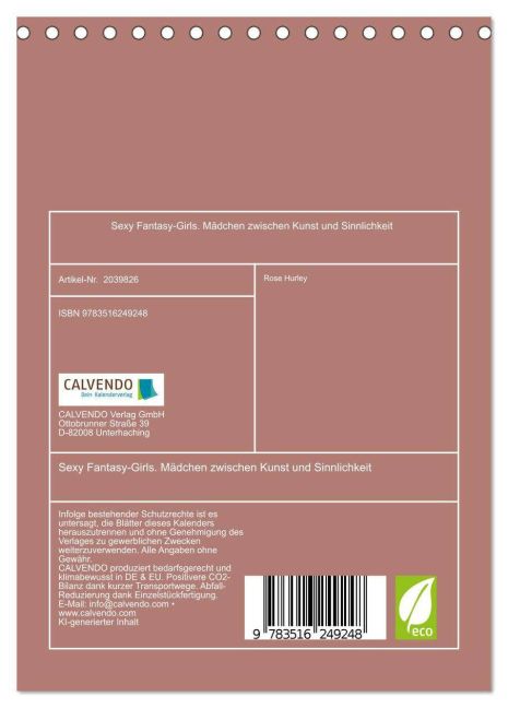 Dieser tolle Kalender vereint atemberaubende Illustrationen von faszinierenden Frauen, die Freiheit, Wildheit, Stärke und Schönheit verkörpern. Jede Seite wurde mit Hilfe von KI erstellt und erzählt eine Geschichte von Selbstbewusstsein und Anmut, eingefangen in sinnlichen Bildern, die die Vielseitigkeit der weiblichen Natur zelebrieren. Perfekt für alle, die die ästhetische und kraftvolle Seite des Frauseins bewundern. Lass dich von der Magie dieser Illustrationen durch das Jahr begleiten.