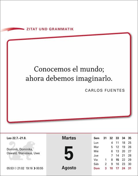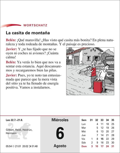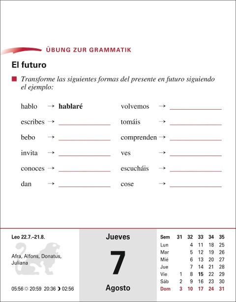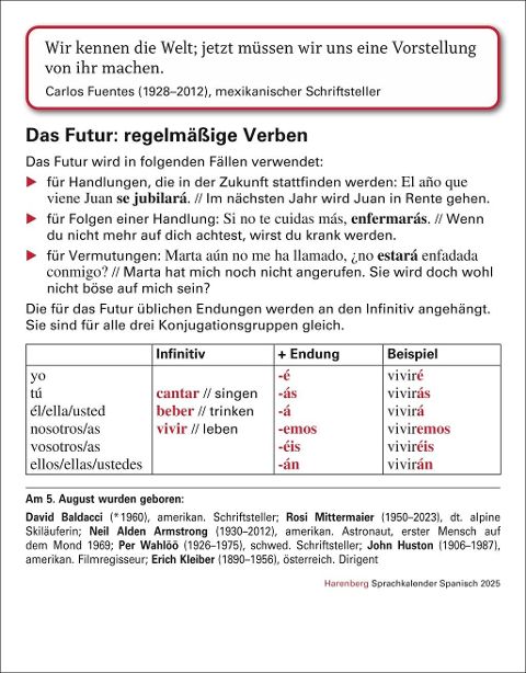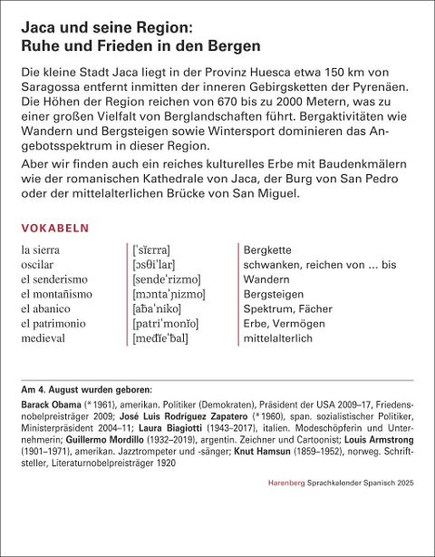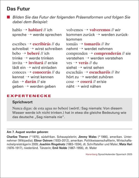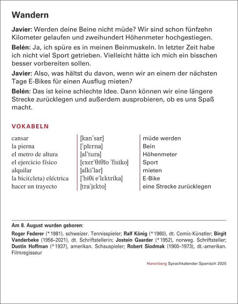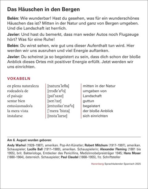- Täglicher Lernerfolg statt anstrengendes Büffeln: Spanisch lernen mit unserem Tagesabreißkalender 2025- Ein Abreißkalender mit mehr als 600 Seiten Alltagsdialogen, Landeskunde, verständlich erklärter Grammatik und abwechslungsreichen Übungen- Vokabelecken mit Lautschrift auf den Rückseiten- Humorvolle Illustrationen von Steffen Butz- Nur zehn Minuten täglich: Spanisch-Grundkenntnisse ausbauen mit System- Für die produktive Auszeit: kompakter Kalender zum Aufstellen, der einfach überall Platz findet, 12,5x16 cm- Jeder Wochentag ein Kalenderblatt, Samstag/Sonntag auf einem Blatt - Neue Sprachen lernen und vertiefen: Jetzt die ganze Vielfalt der Sprachkalender von Harenberg entdecken