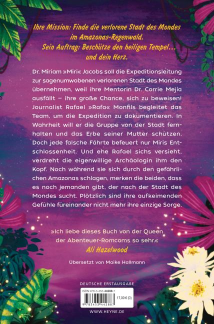 Dr. Miriam 'Miri' Jacobs soll die Expeditionsleitung zur sagenumwobenen Verlorenen Stadt des Mondes übernehmen, weil ihre Mentorin Dr. Corrie Mejía ausfällt - ihre große Chance, sich zu beweisen! Journalist Rafael 'Rafa' Monfils begleitet das Team, um die Expedition zu dokumentieren. In Wahrheit will er die Gruppe von der Stadt fernhalten und das Erbe seiner Mutter schützen. Sein Plan: Sie auf den falschen Weg führen. Doch jede falsche Fährte befeuert nur Miris Entschlossenheit. Und ehe er sichs versieht, verdreht die eigenwillige Archäologin ihm den Kopf. Noch während sie sich durch den gefährlichen Amazonas schlagen, merken die beiden, dass es noch jemanden gibt, der nach der Stadt des Mondes sucht. Plötzlich sind ihre aufkeimenden Gefühle füreinander nicht mehr ihre einzigen Sorgen...