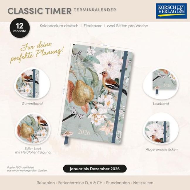 Dieser Classic Timer ist stets zur Hand, bequem in der Tasche verstaut und oder schick auf dem Tisch platziert ein Kalender für jede Lebenslage und ein absolut trendiger Alltagsbegleiter. Zu seiner Ausstattung geh ören ein flexibles Softcover mit Gummi- und Leseband, ein 12-monatiges, deutschsprachiges Kalendarium mit einer Doppelseite pro Woche und jede Menge Platz für Notizen auf trendigen dotted Seiten.