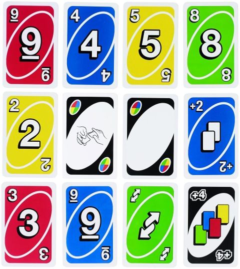 Der schnelle Spaß für alle und weltweit das beliebteste Familienkartenspiel. Ziel des Spiels ist es, zuerst alle eigenen Karten nach Zahl und Farbe abzulegen. Vier verschiedene Aktionskarten "Zieh 2", "Zieh 4", "Aussetzen" und "Retour" sorgen im Spielverlauf für überraschende Wendungen. Wer zuerst 500 Punkte erreicht ODER alle Karten ablegt, gewinnt das Spiel. Punkte bekommt die Person, die zuerst alle Karten abgelegt hat. Sie erhält Punkte für die Karten, die die anderen Personen noch nicht abgelegt haben. Bevor sie die vorletzte Karte ablegt, muss sie jedoch "Uno!" rufen, sonst muss sie zwei Strafkarten aufnehmen. Inhalt: 108 Karten (19 blau, 19 grün, 19 rot, 19 gelb, 8 "Zieh-2"-Karten, 8 "Retour"-Karten, 8 "Aussetzen"-Karten, 4 Farbenwahlkarten, 4 Farbenwahl-"Zieh-4"-Karten). Für 2 - 10 Personen ab 7 Jahren, Spieldauer: ca. 15 Min., bzw. variabel, da das Spiel bei einem bestimmten Punktestand beendet ist oder, wenn eine Person alle Karten ablegen konnte.