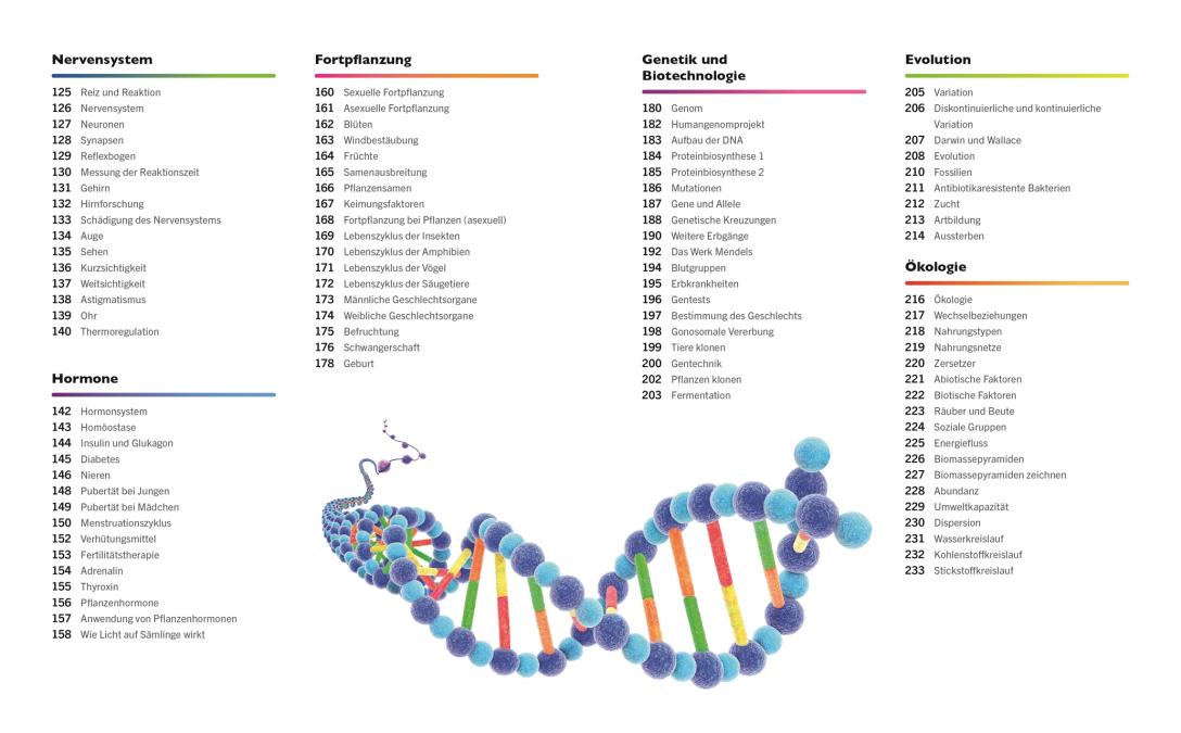 . Alle wichtigen Themen und Abläufe der Biologie: Anschauliche Doppelseiten erwecken die Wissenschaft zum Leben und erleichtern Schüler*innen den Einstieg in die Materie - von der Definition von Leben über das Nervensystem und die Evolution bis zur Gesundheit und den Einfluss des Menschen auf die Umwelt.