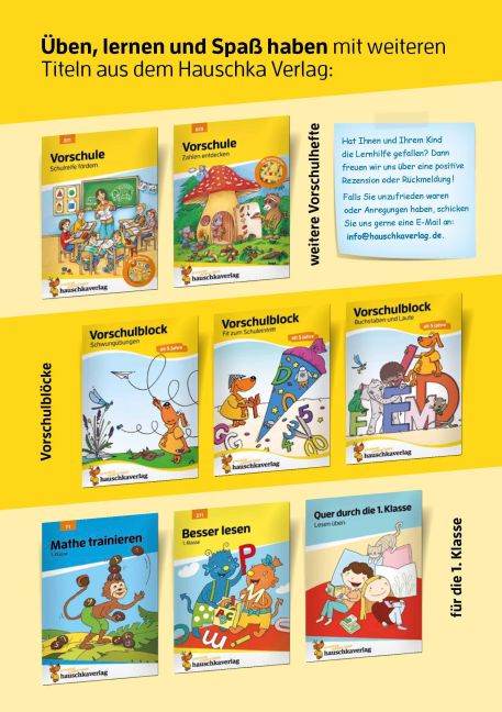 Mit unseren Vorschulheften werden die Kinder im Alter ab 5 Jahren spielerisch auf die Anforderungen in der Schule vorbereitet. In vielen abwechslungsreichen Rätseln und Übungen werden sowohl die Konzentrationsfähigkeit und das Durchhaltevermögen der Kinder gefördert als auch erste mathematische und sprachliche Fähigkeiten angebahnt. Die Übungen bieten somit eine ideale Vorbereitung auf die Grundschule. So werden die Kinder Schritt für Schritt fit für den Schuleintritt. Alle Aufgaben sind altersgerecht konzipiert und liebevoll illustriert. Durch das handliche Format eignen sich die Hefte als Reisebegleiter, für lange Wartezeiten, Bahnfahrten, Restaurantbesuche, verregnete Nachmittage oder einfach für zwischendurch!